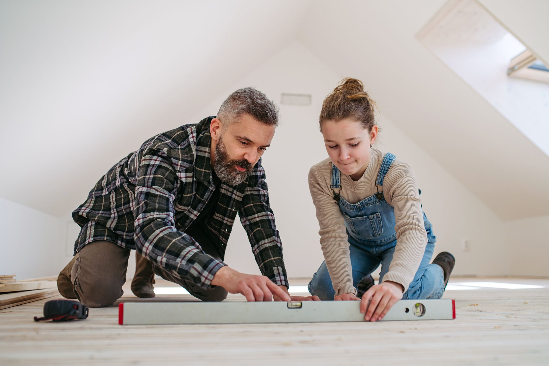 Dad teaching young daughter how bubble level tool works.